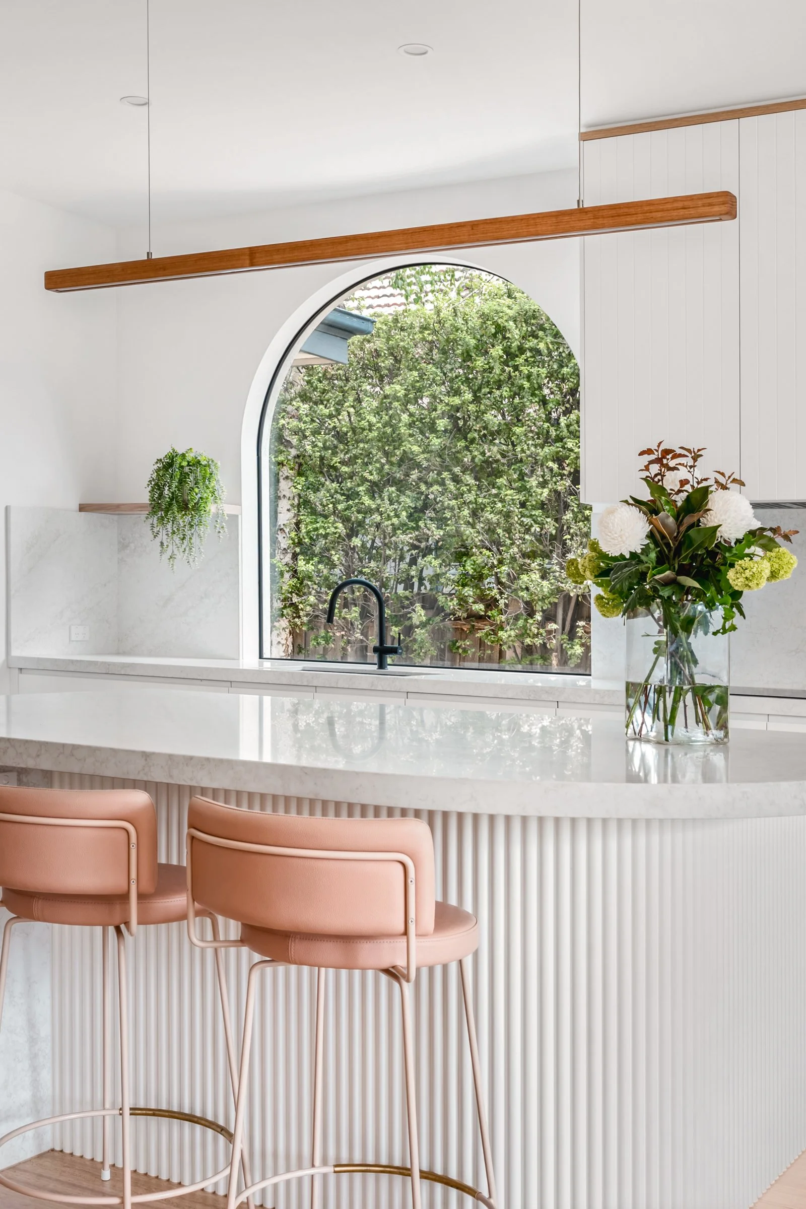 In WITNEY, Beth borrowed details from the living room to visually soften the kitchen. Oak appears in shadow lines, floating shelves and integrated fridge pulls, while VJ panelling is carried across to the fridge wall so the room feels anchored between two tall elements. The island became a true entertainer’s anchor: a little shorter but now 1.4 metres deep, with generous seating set away from the cooking side, a fluted back, soft curve and porcelain stone wrapped around the rear. It reads more like a beautiful piece of furniture than a block of joinery.