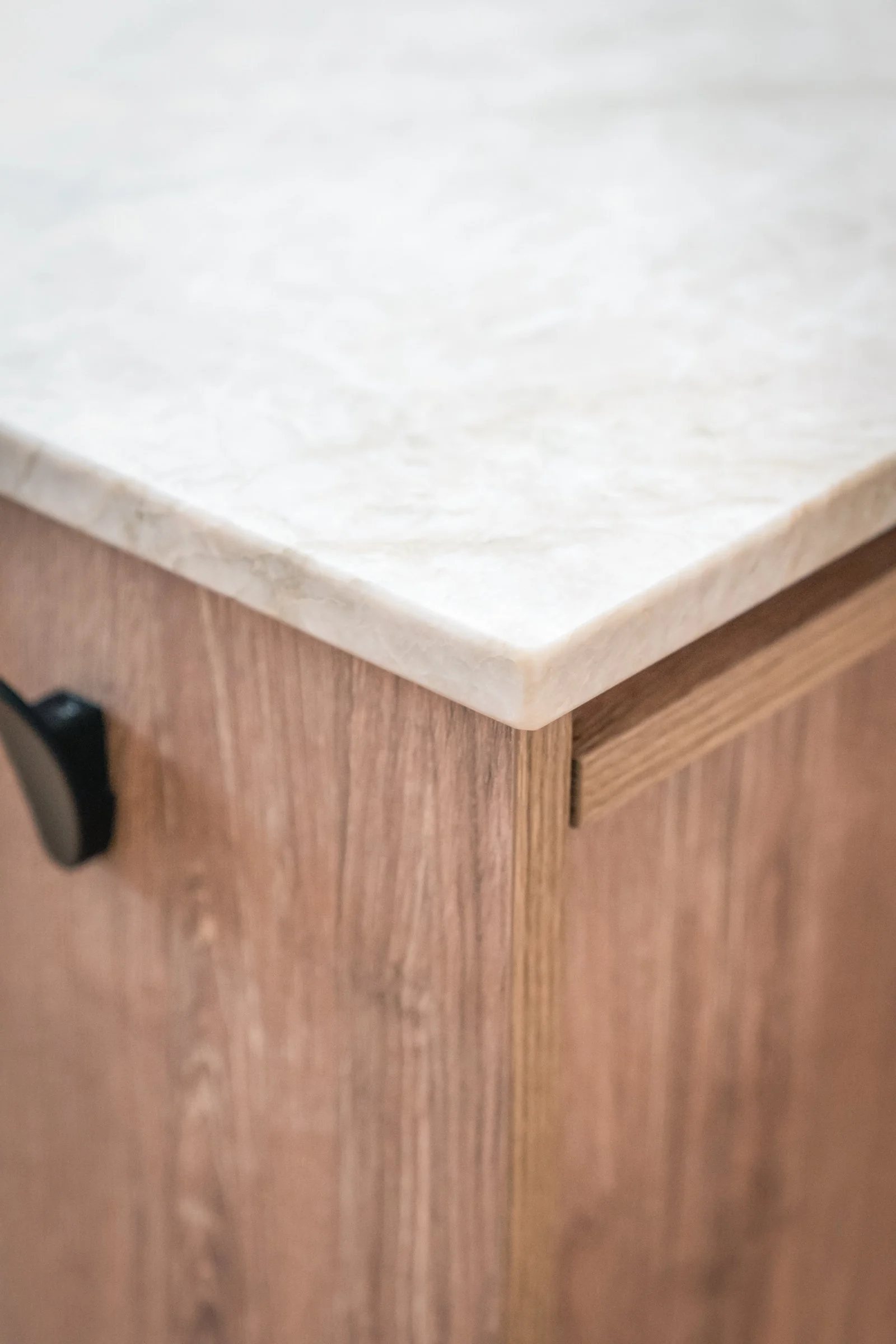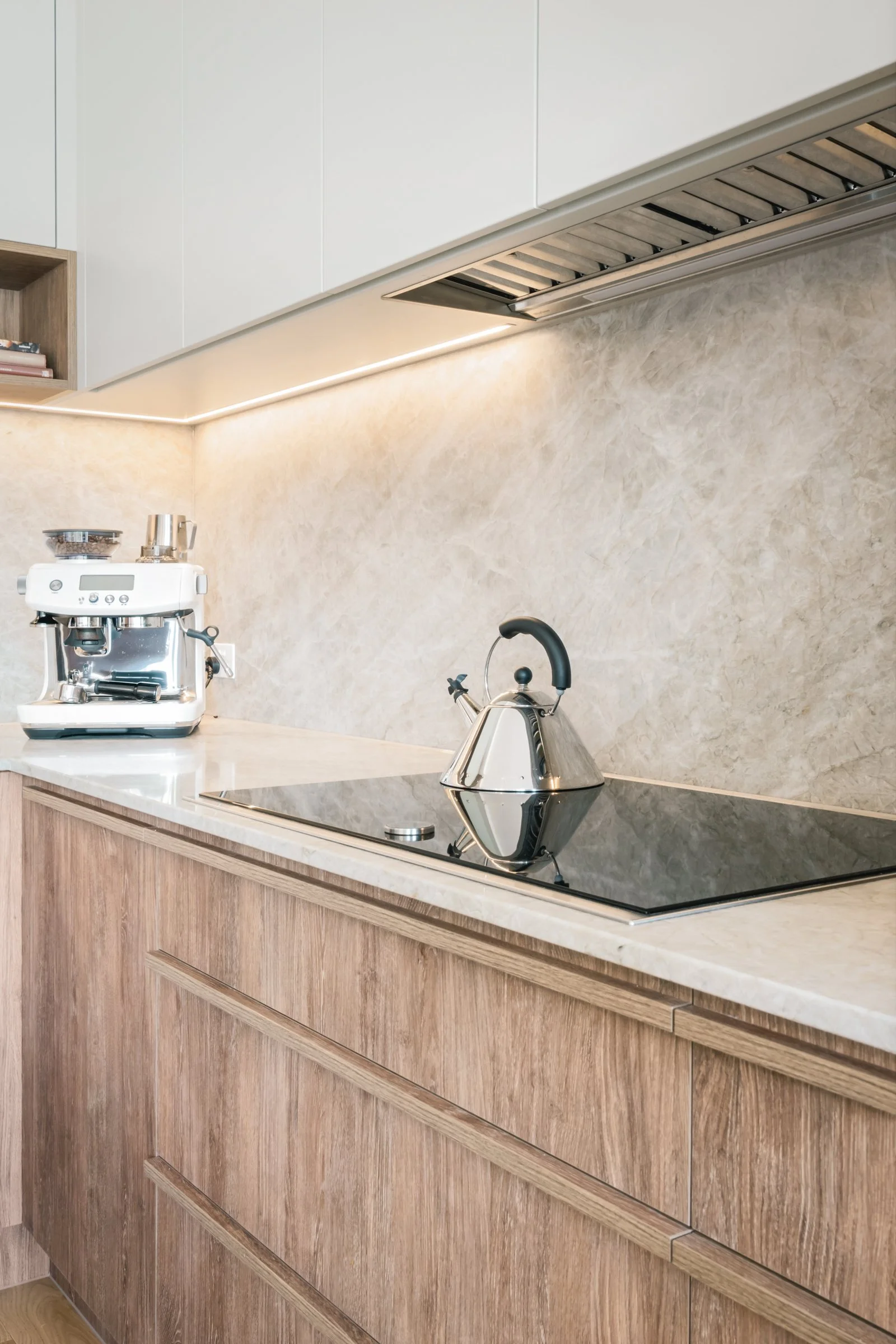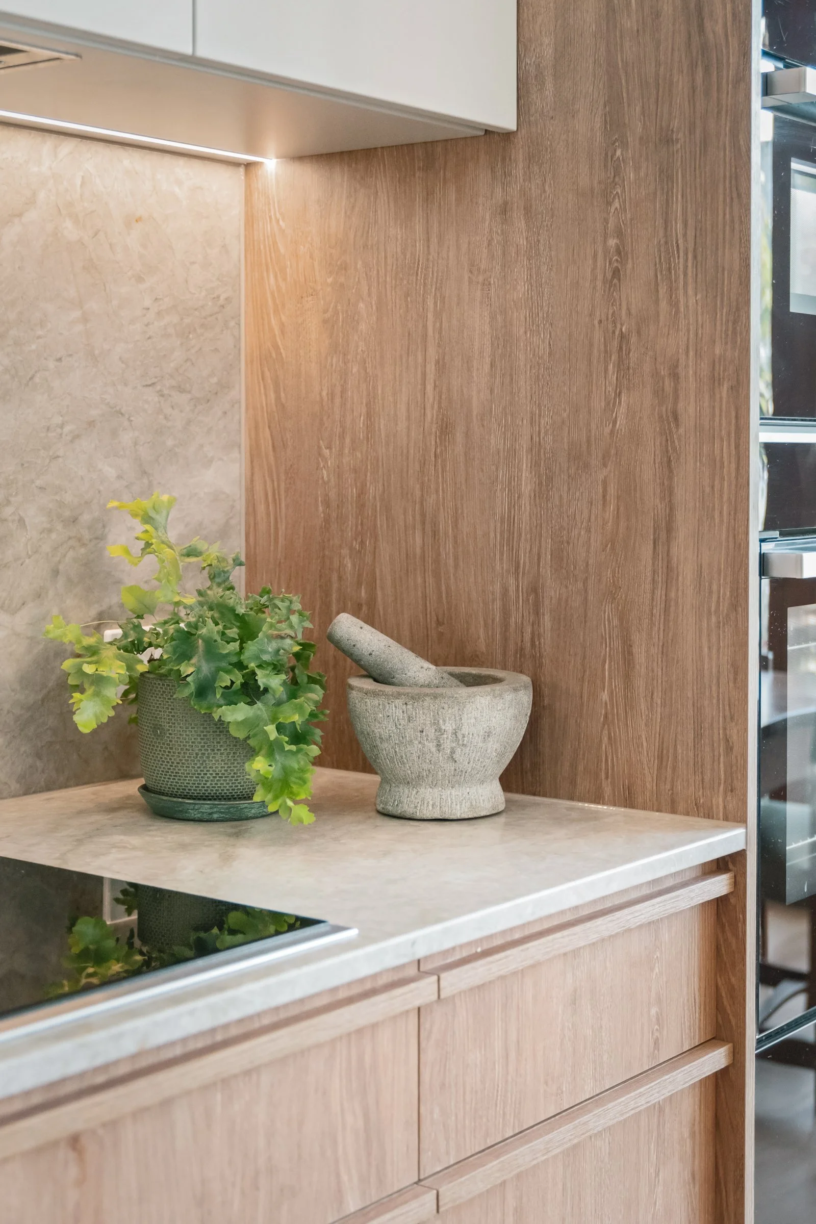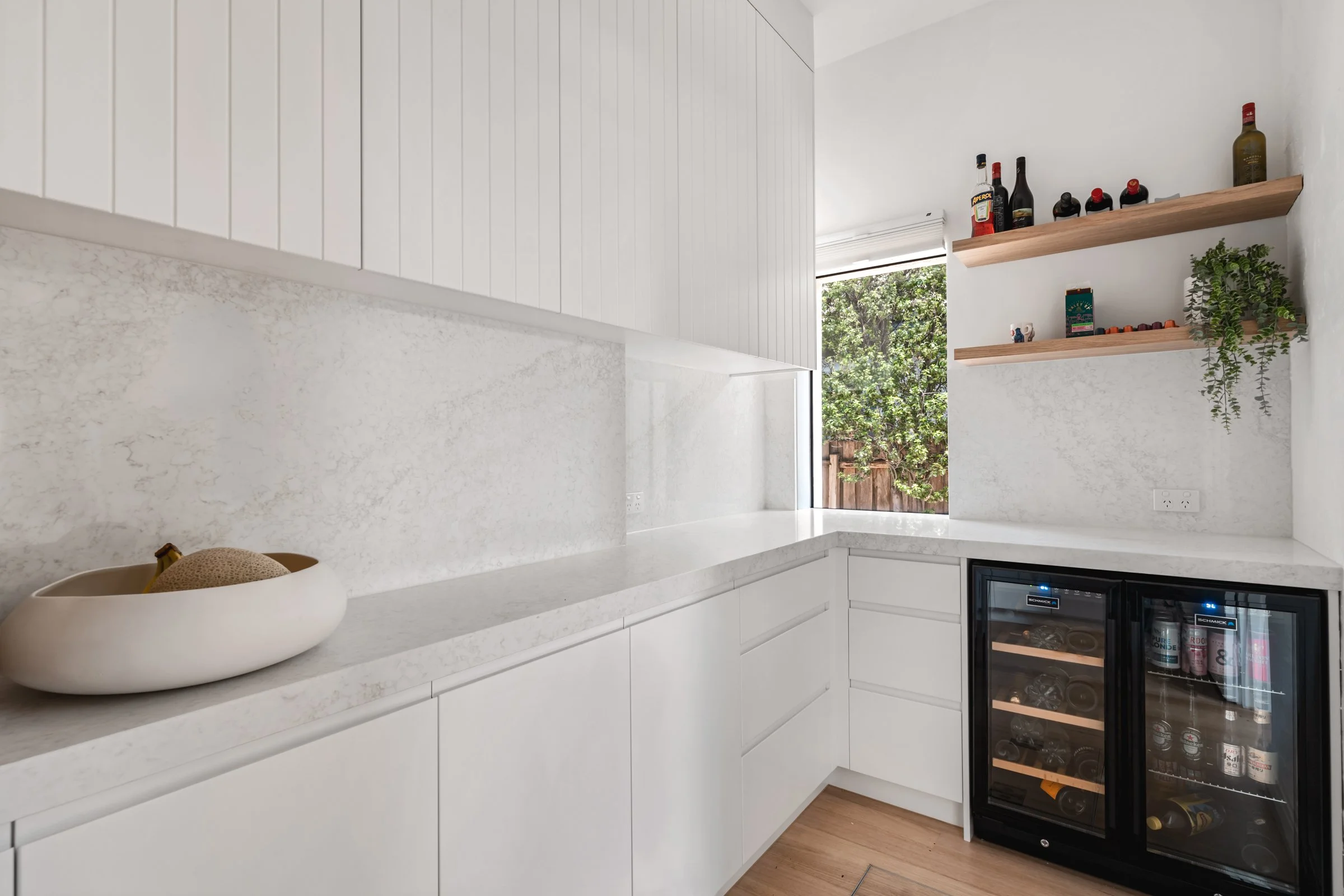 In WITNEY, the butler’s pantry was transformed from a clutter zone into a genuine workspace. It now holds a coffee, tea and drinks station plus generous bench space, so the main kitchen can look composed even when life is at full tilt. Doors close over the parts you don’t want to see; open shelves around the corner keep frequently used items within reach. A slim cargo pull-out beside the cooktop keeps oils and spices exactly where you instinctively reach for them, and a dedicated home for the robo-vac means the house can quietly look after itself in the background.